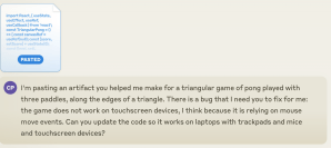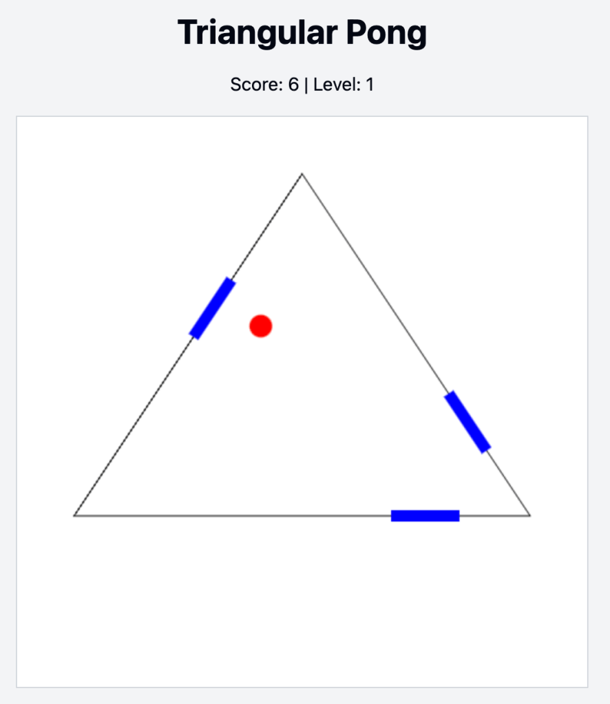 I did not write a single line of code. I described what I wanted, iterated back and forth, and it figured how to control the three paddles with one trackpad and all of the ball bouncing physics, which is made a lot more complicated by having two of the walls at an angle.