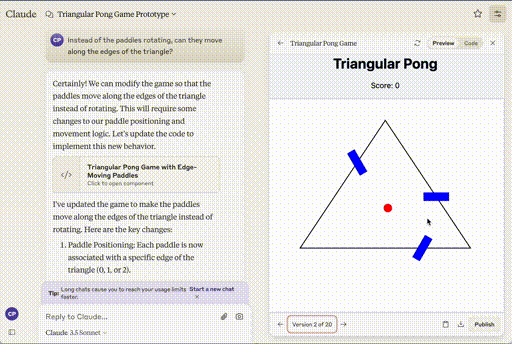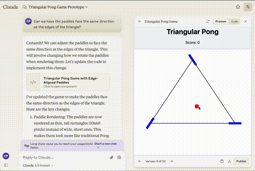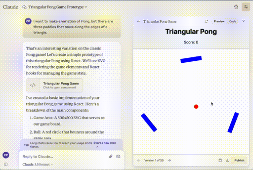 Large Language Models are pretty good at implementing the kinds of things that developers do all day every day because there is plenty of representative data in its training set. To see how good Claude is at doing something a little different, I gave it an off-the-wall example to see how well it adapts. I decided to try Pong, with three paddles. I started out with a simple prompt: